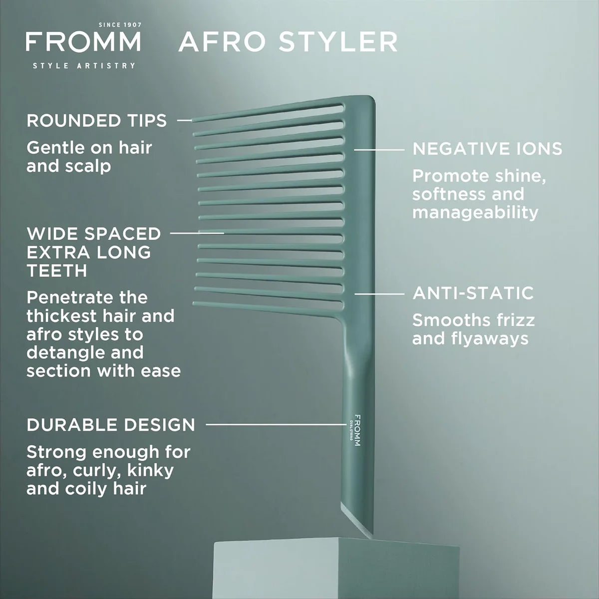 Built for volume and control, the FROMM Afro Styler Rake Comb features wide-spaced, extra-long teeth that glide through thick, curly, and coily textures with ease. Its durable design and ergonomic handle make it ideal for detangling, shaping, and adding lift—wet or dry.