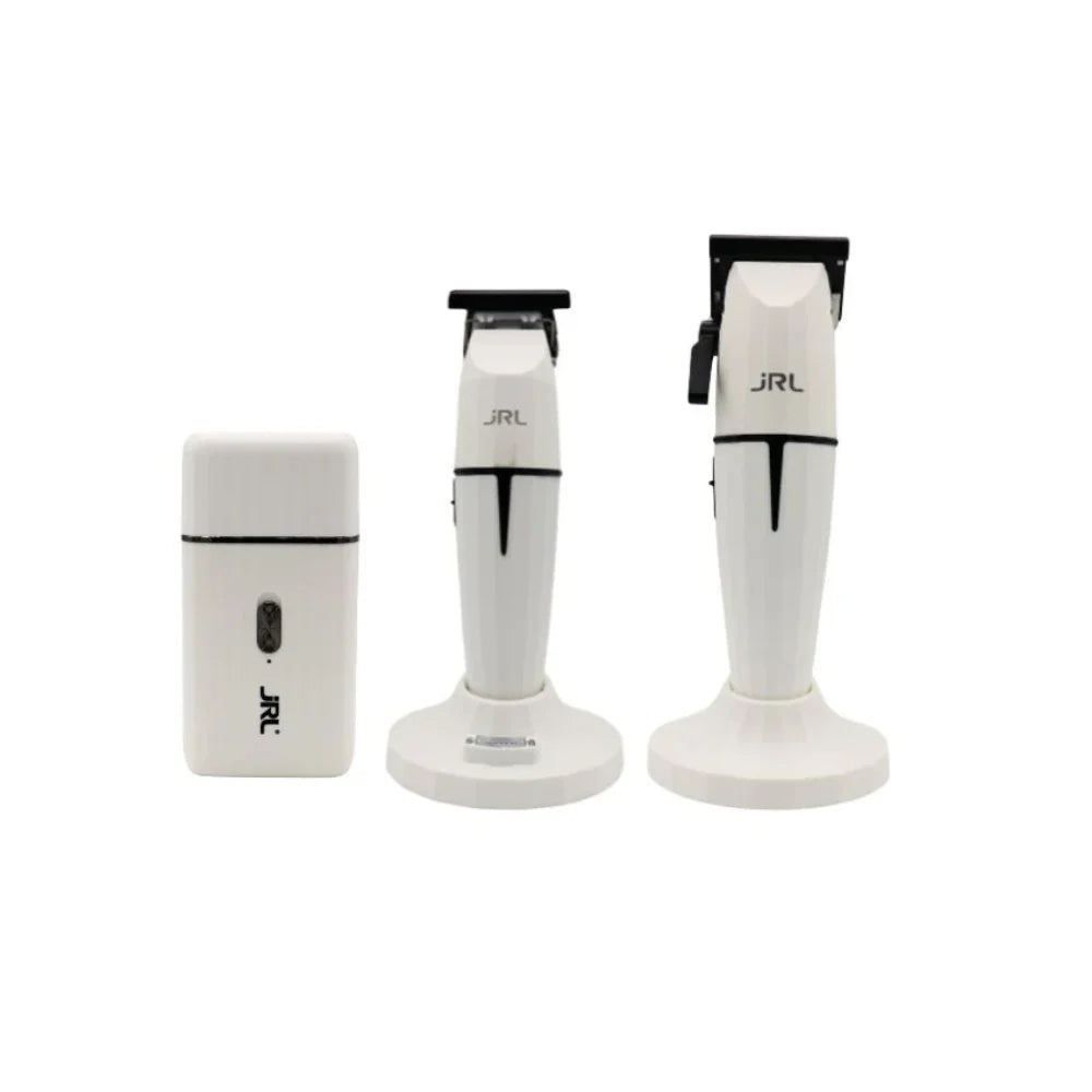 The JRL Ghost Collection delivers top-tier performance in a sleek, matte white finish. This complete set includes the Ghost Clipper, Trimmer, and Foil Shaver—plus 2 dual charging bases to keep your station powered and organized.